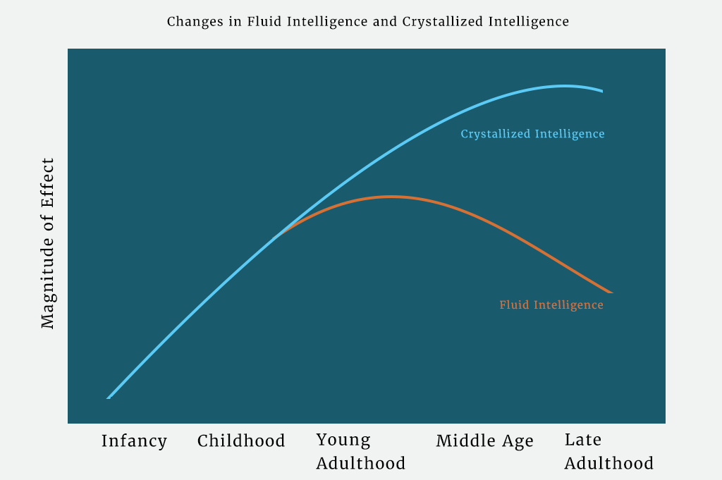 If you have ever taken a psychology course in the past or even a business course on motivations, you will notice that this looks a lot like Maslow’s Hierarchy of Needs. Crystalized intelligence can lead directly to self-actualization, as defined by Maslow. This is the level where your basic (food/safety) and psychological needs (love/belonging/esteem) are met, and you go on to fulfillment by transcending self. It is a time to reach your full potential by pursuing your inner talents.