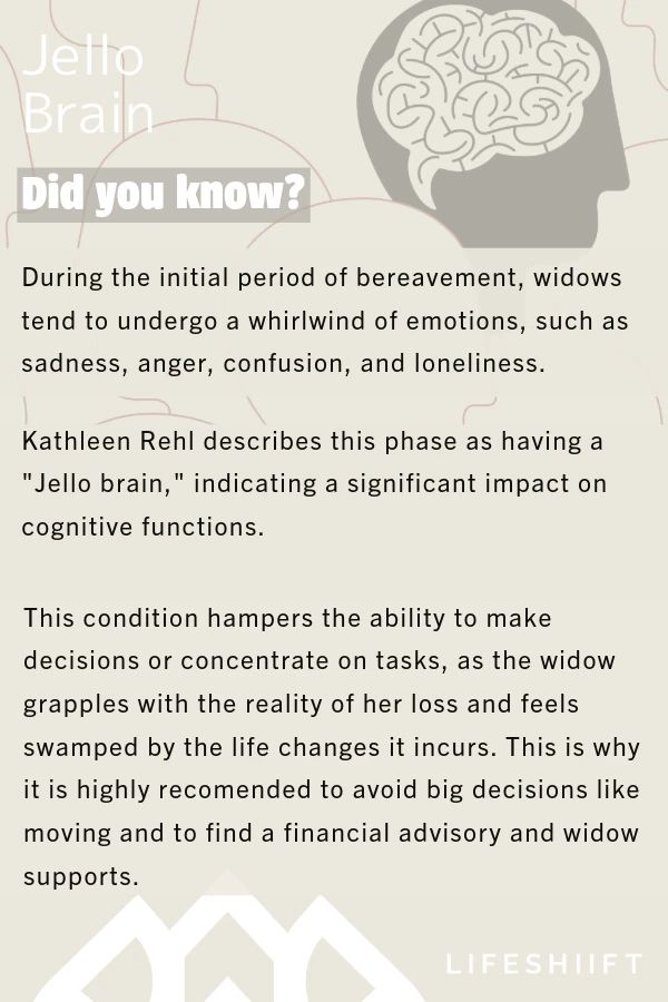 “Early grief is what many widows call ‘Jello brain.’ Your thinking has changed. You’re not processing information the same way.”
