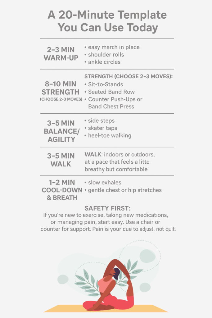Safety first: If you’re new to exercise, taking new medications, or managing pain, start easy. Use a chair or counter for support. Pain is your cue to adjust, not quit.